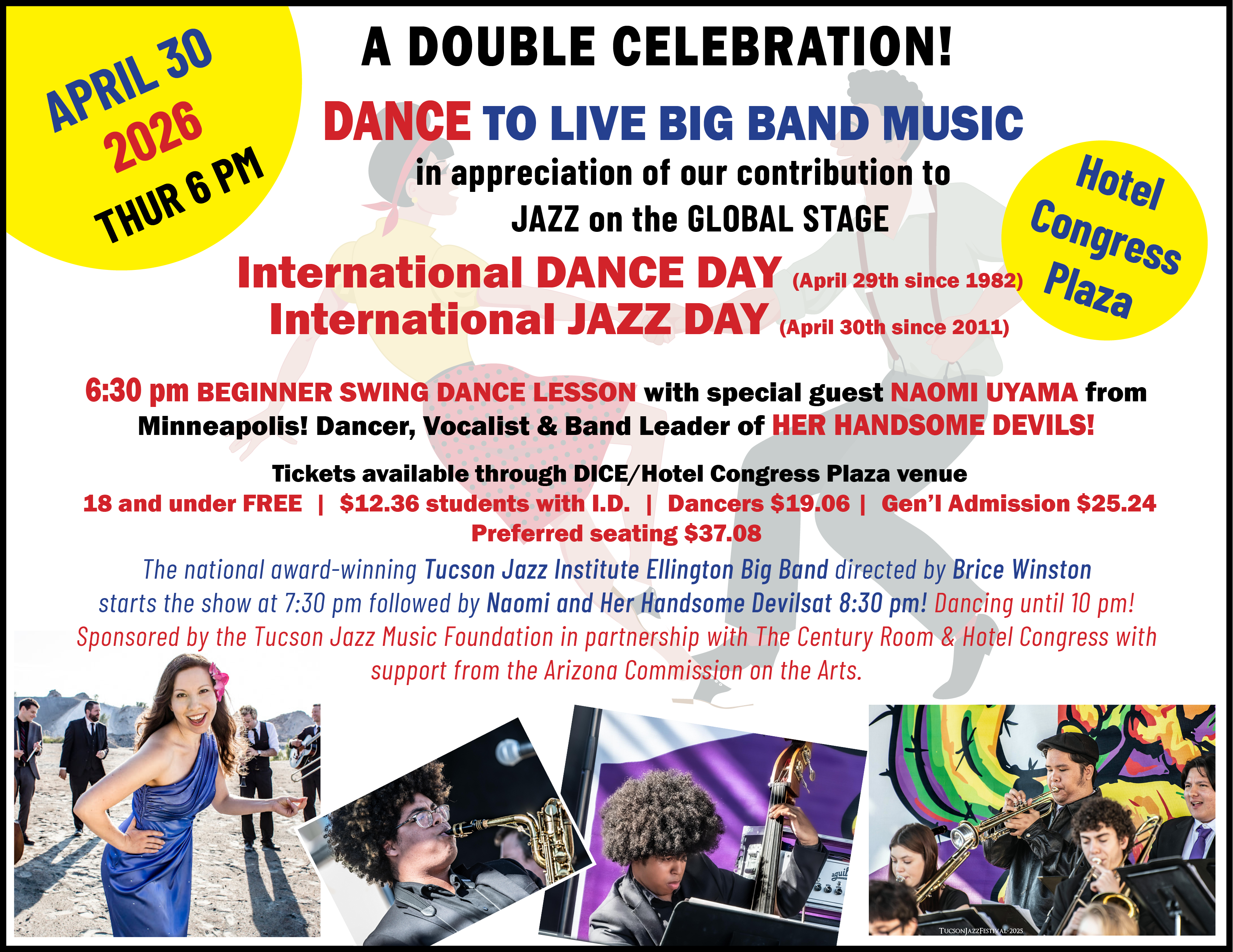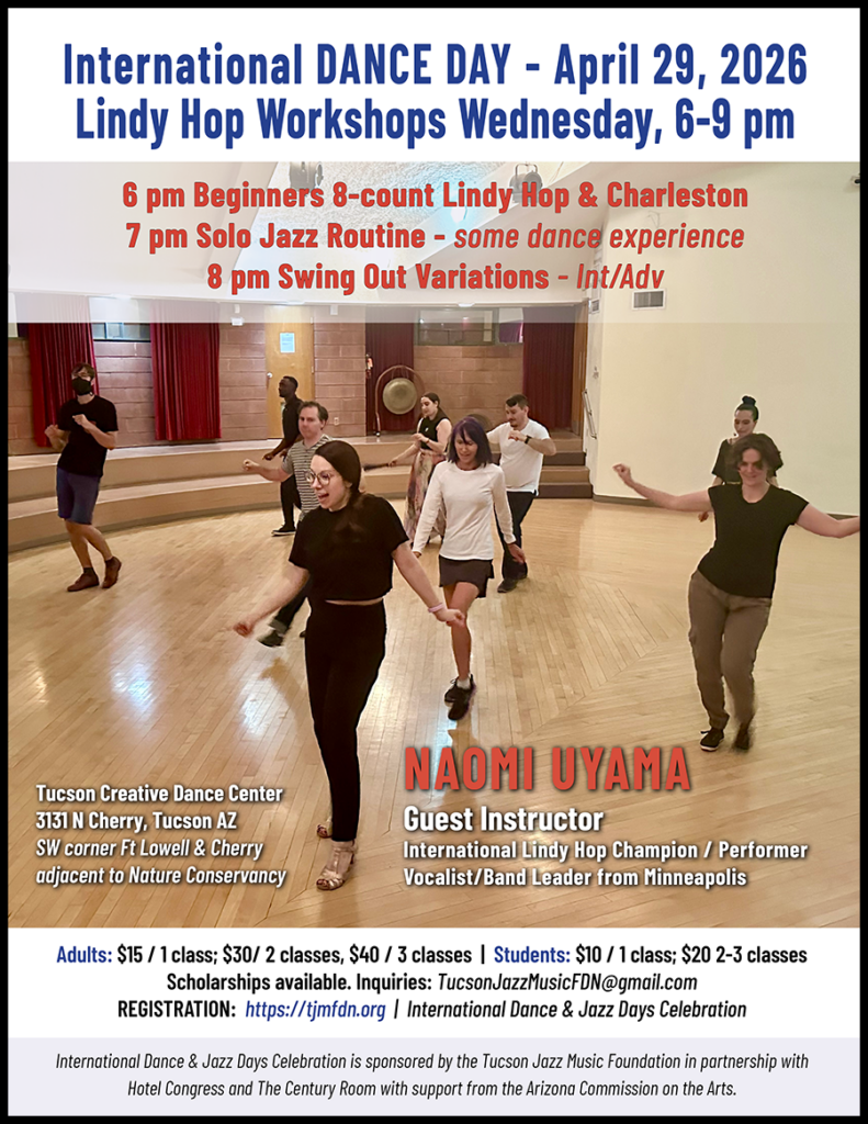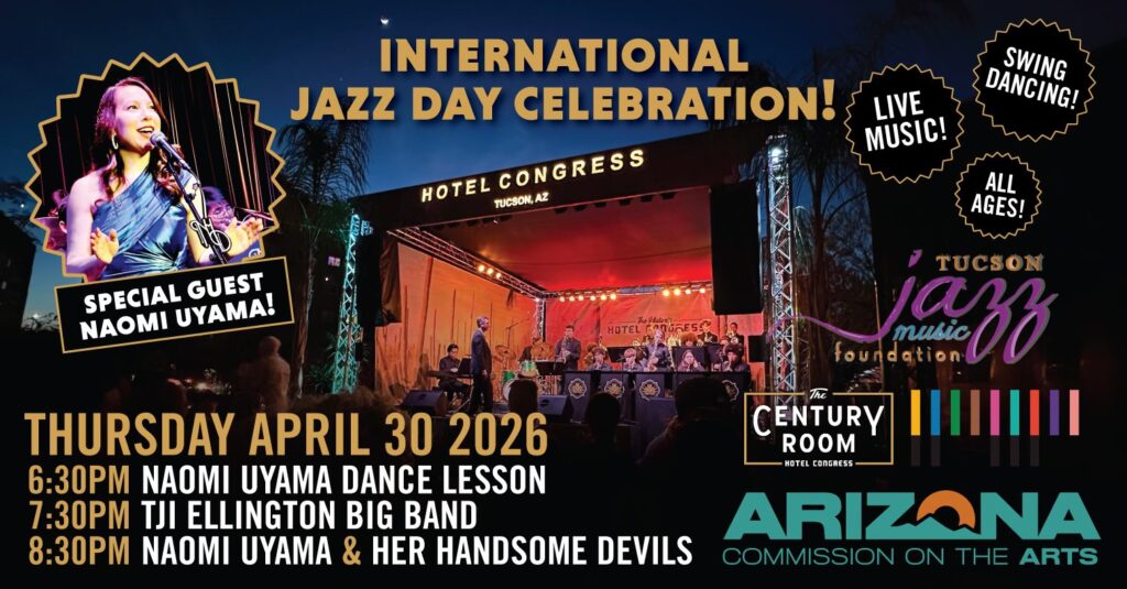 Featuring musical performances by the national award-winning Tucson Jazz Institute Ellington Big Band and Naomi & Her Handsome Devils, PLUS DANCE LESSONS and performances by international swing dance superstar Naomi Uyama!