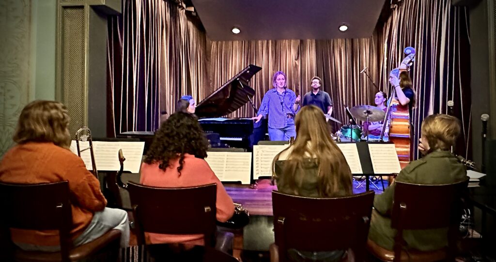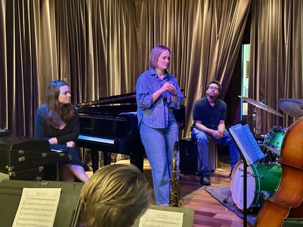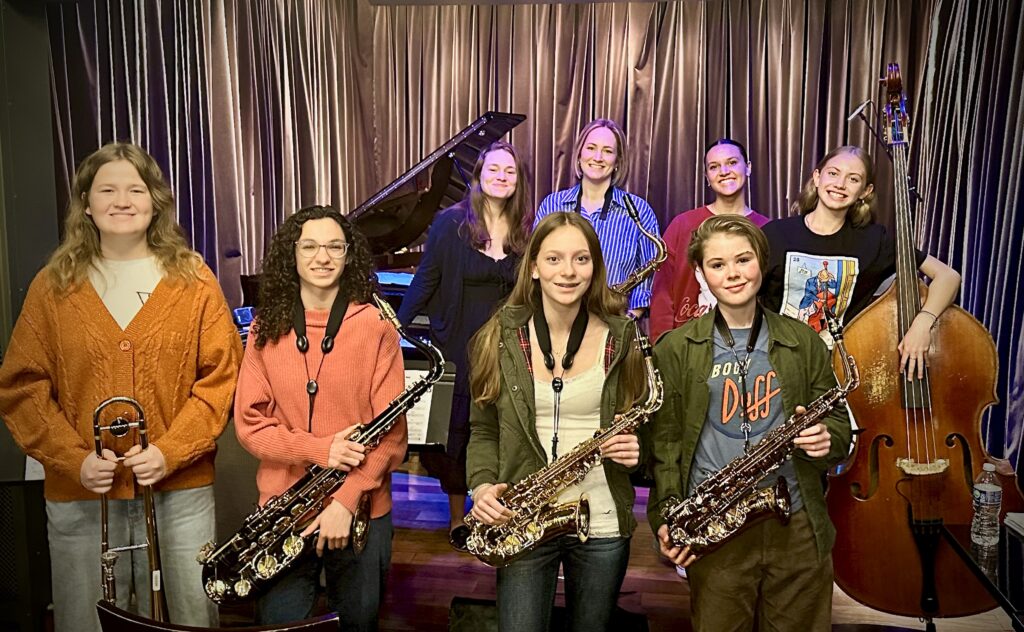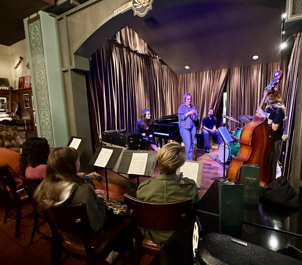 Roxy Coss has visited Tucson many times and has been a master clinician with the Tucson Jazz Institute Ellington Big Band on several occasions. This time she was a headliner at The Century Room and we invited her to lead an all girls combo prior to her performance on Sunday, January 25, 2026. The girls were recruited from different schools and together for the first time for this special clinic. It was also Roxy’s first time leading a clinic of students that have never been together before. She shared two of her compositions with the girls and gave many tips on how to improve their technique, find the power, and improvise. She also provided them with a brief description of her career path and outlined what a possible path would be for them in the world of jazz — as there is a demand for ‘women in jazz.’ Assisting Roxy were her bandmates – Caili O’Doherty/piano and Cory Cox/drums.