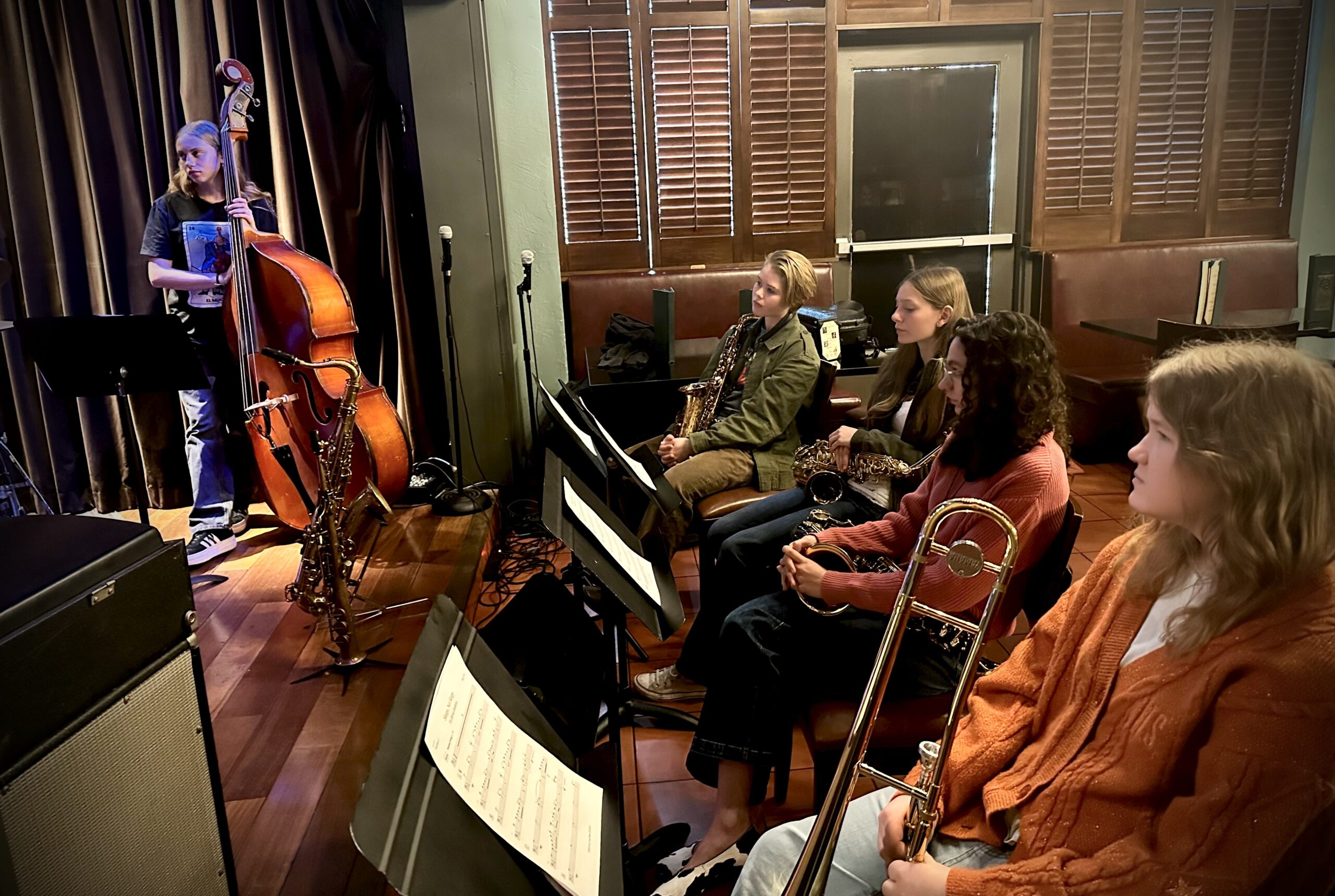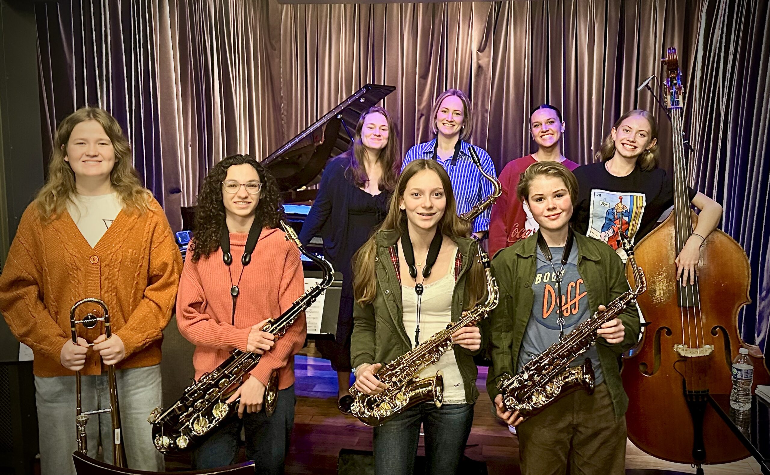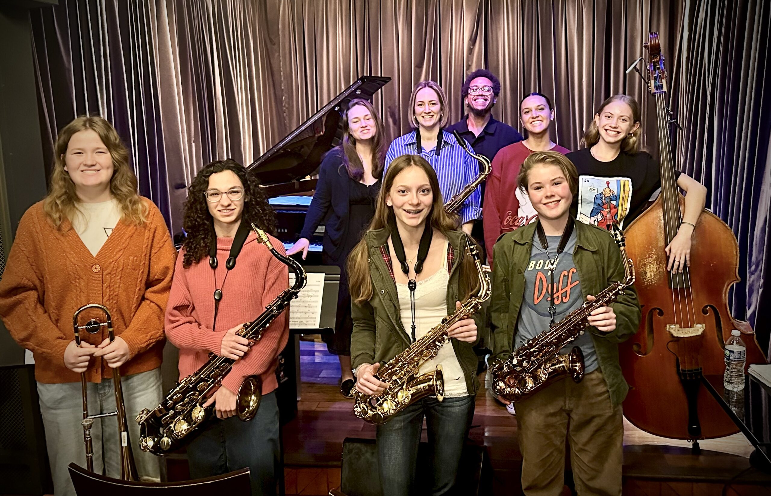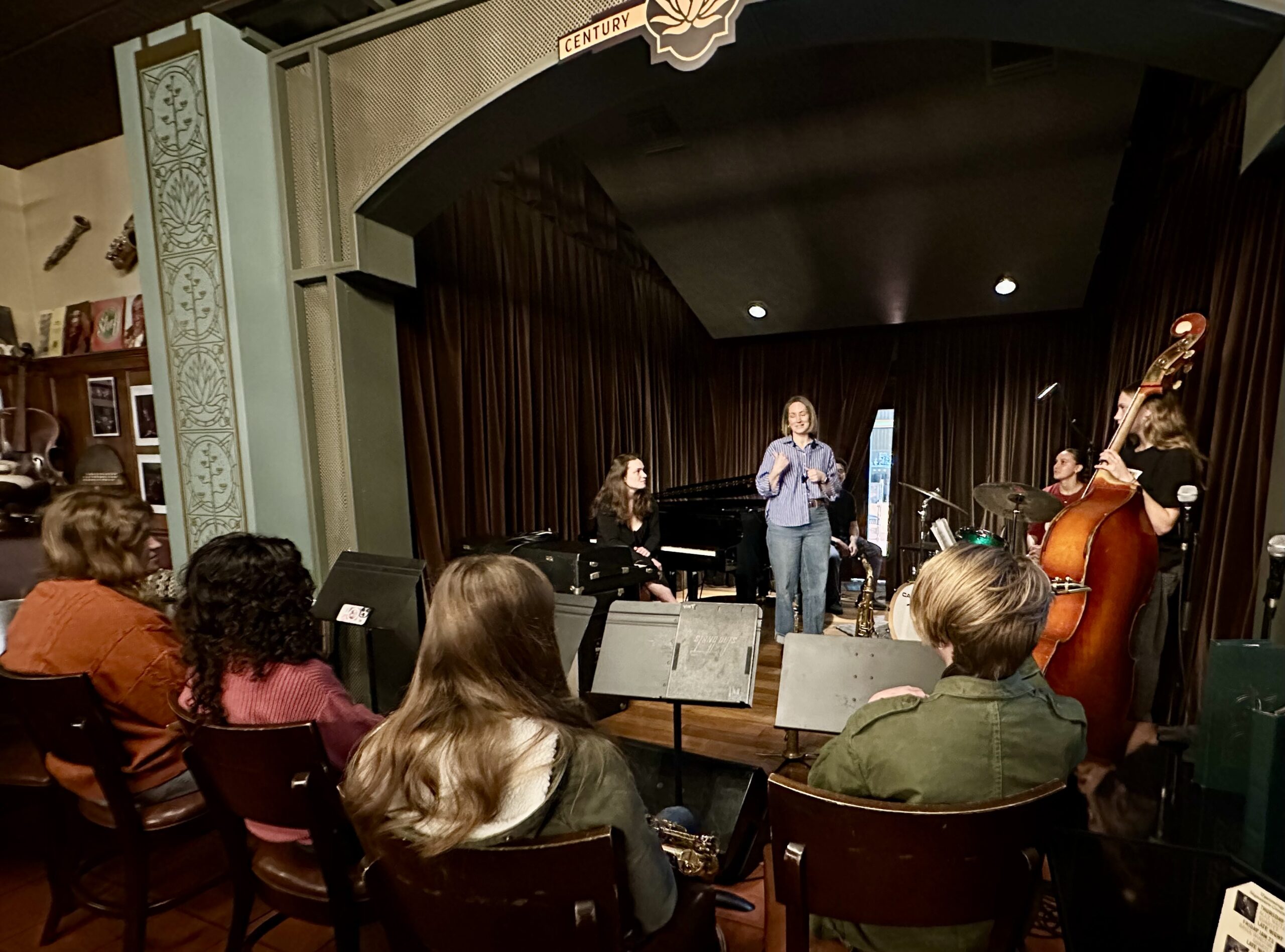 Roxy Coss has visited Tucson many times and has been a master clinician with the Tucson Jazz Institute Ellington Big Band on several occasions. This time she was a headliner at The Century Room and we invited her to lead an all girls combo prior to her performance on Sunday, January 25, 2026. The girls were recruited from different schools and together for the first time for this special clinic. It was also Roxy’s first time leading a clinic of students that have never been together before. She shared two of her compositions with the girls and gave many tips on how to improve their technique, find the power, and improvise. She also provided them with a brief description of her career path and outlined what a possible path would be for them in the world of jazz — as there is a demand for ‘women in jazz.’ Assisting Roxy were her bandmates – Caili O’Doherty/piano and Cory Cox/drums.